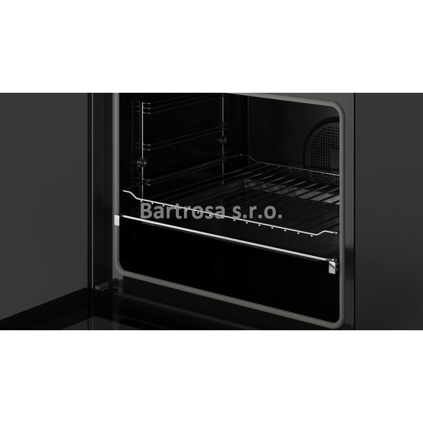 - Až 75% odsávání zásobníku pro vyšší komfort a přizpůsobivost. Trouba má chromované podpěry s teleskopickými lištami, které umožňují snadnější vyjmutí plechů a vaření až v pěti výškách.